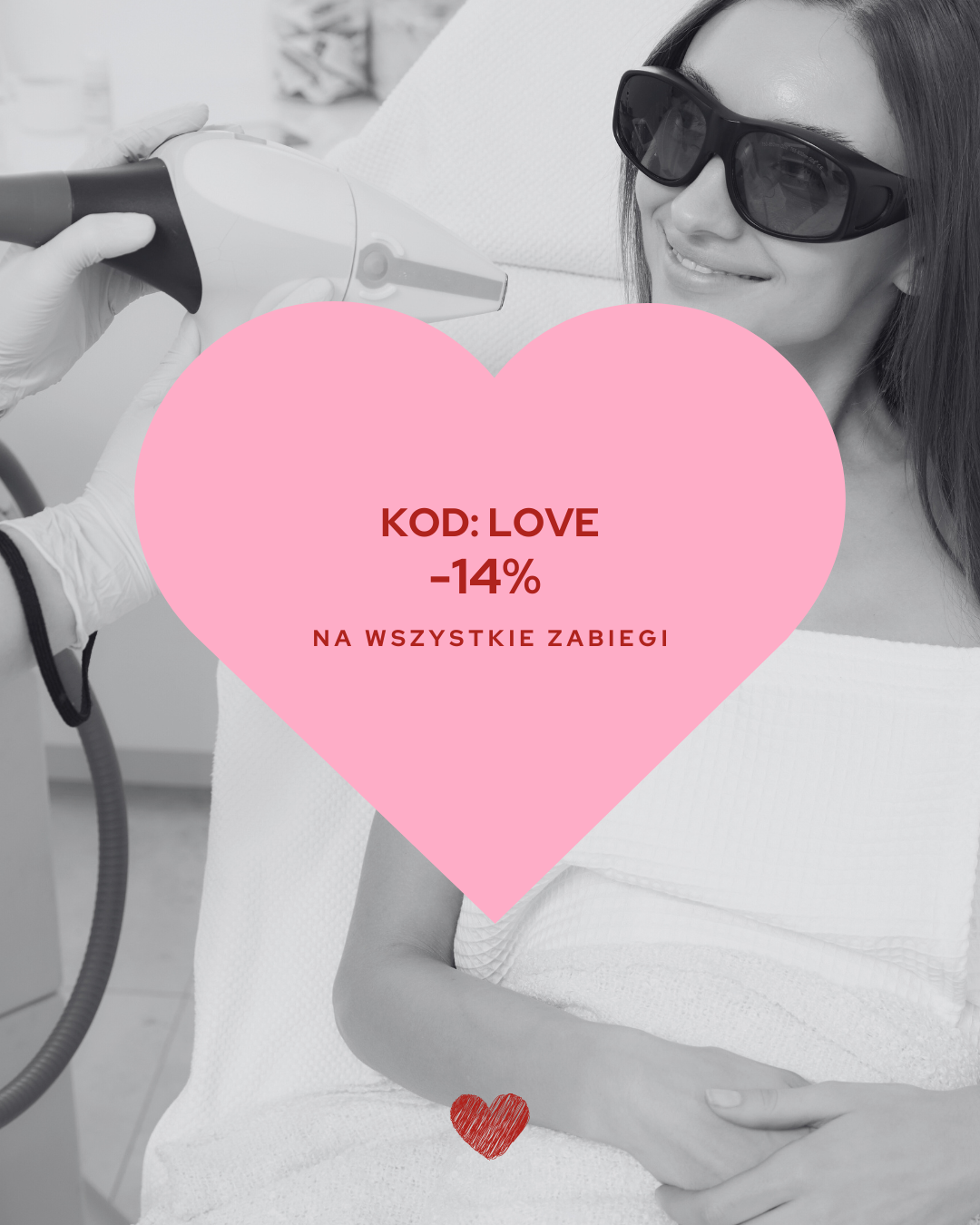 W dniach 11.02–28.02.2026 r. na hasło „LOVE” otrzymasz -14% rabatu na wszystkie zabiegi z naszej oferty.